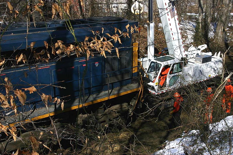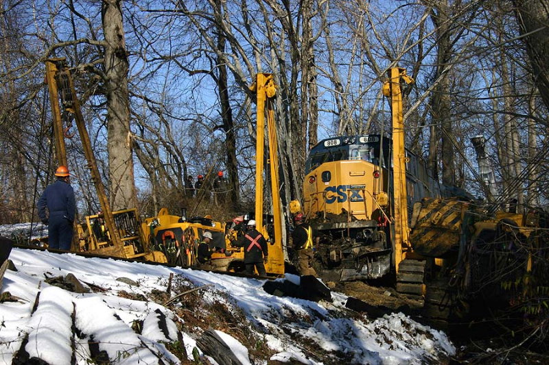 Description: Here they attach the cranes to the front of 808 to set the lead truck on the rail. After the truck is on the rails, they will push the unit ahead and re-rail the rear truck. It took about two hours to get everything back on the rails. |