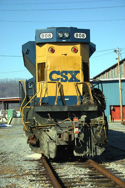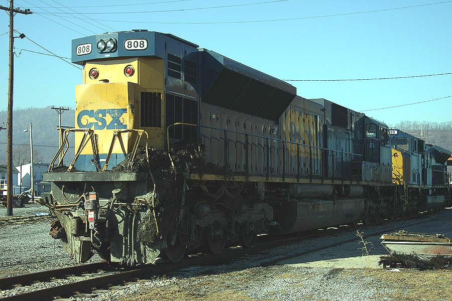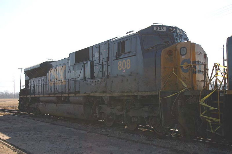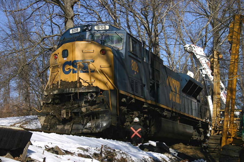 Description: General view of the 808 from the engineer's side. Much of the debris was removed before they left the derailment scene. The guy with the shovel had removed quite a bit as well. Unfortunately for him, the sun was on the side with the least dirt so it was still hard as a rock. Tough way to spend Super Bowl Sunday altough not as tough as it was for Bill Cowher. |