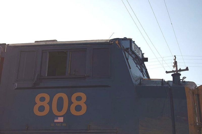 Description: Here is a general view of 808's rear. Much of the upper damage near the sand box was from the hopper cars piling up behind it during the derailment. Notice the dirt on the walkway to the left. |