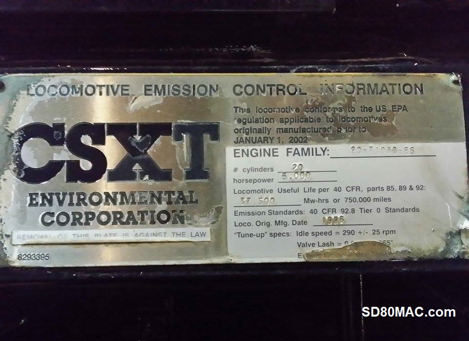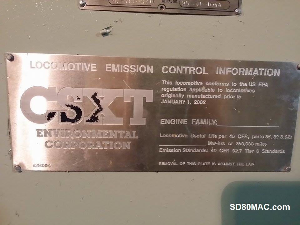 Description: CSXT Emissions Control Information plate mounted to NS 7222's prime-mover. |