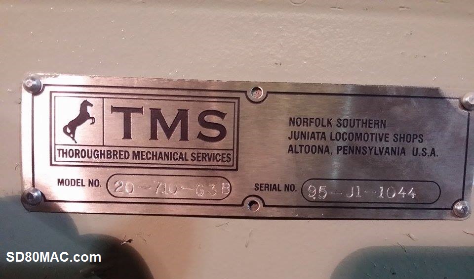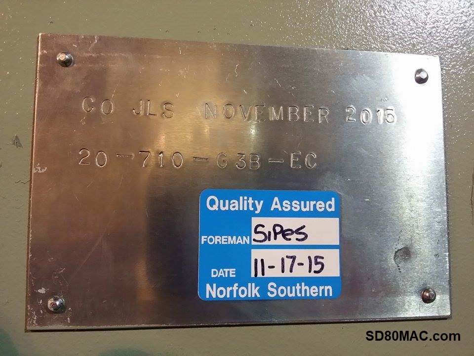 Description: When the CSX 80MACs were acquired by NS, the 7222 has a broken crankshaft. This plate and the primer-mover it's attached to were rebuilt by the Juniata Shops in November 2015. |