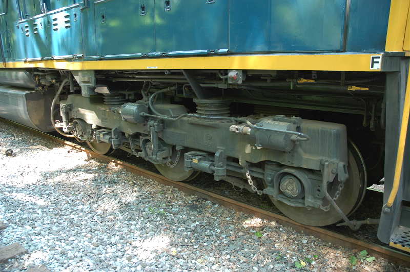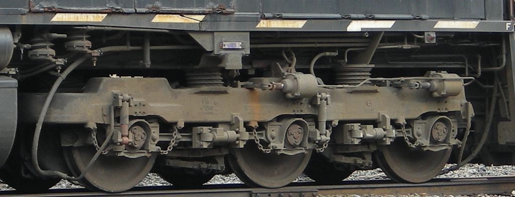 Description: In this shot you can seen an overall view of the engineer's side rear end including the truck, pilot, radiator wings, sand box, markers, and dynamic brake grilles. |